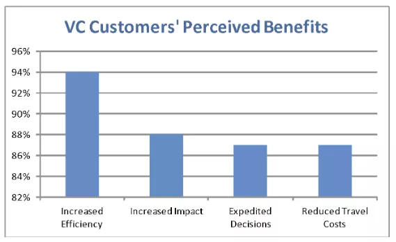 בסקר שביצעה חברת הייעוץ והאנליסטים הגלובאלית Wainhouse Research בקרב משתמשי קצה בארגונים בהם מוטמעים פתרונות וידאו קונפרנס ,(VC) נשאלו משתמשי הקצה על יתרונות השימוש בוועידות וידאו וכפי שניתן לראות בתוצאות בטבלה המצורפת: 94% מהמשתמשים חושבים שקיום ועידות בוידאו משפר את היעילות העסקית.