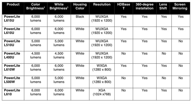 הסדרה כוללת שבעה דגמים שונים אותם ניתן לראות בטבלה. הדגמים המתקדמים ביותר (L615U בצבע שחור ו-L610U בצבע לבן) מספקים עוצמת בהירות של 6000 לומנס (גם של הצבע הלבן) ורזולוציה של עד 1920X1200 (WUXGA), בנוסף למספר תכונות נוספות: