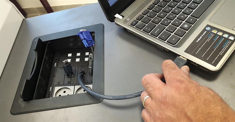 בכל עמדה הוטמעה קופסת חיבורים שקועה KRAMER TBUS 1N המספקת למרצה את כל הכלים הנדרשים להפעלת הכיתה; כבלים נשלפים המאפשרים חיבור קל ומהיר של מחשבים ניידים למקרן, ללא צורך בנשיאת כבלים מכיתה לכיתה ושקעי חשמל להטענה.