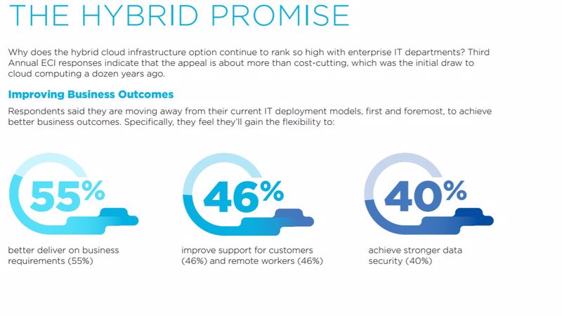 ארגונים נקטו בצעדים משמעותיים על מנת לגבש ולבחור את מודל תפעול מערך ה- IT שלהם: משיבי הסקר מדווחים על נקיטת צעדי מפתח ראשוניים להפעלת סביבה היברידית מוצלחת, כולל אימוץ תשתית hyperconverged-infrastructure במרכזי הנתונים שלהם והפעלת מרכזי נתונים אחרים שאינם תומכים בענן, לטובת שימוש בענן פרטי וציבורי. צוותי IT גלובליים מתכננים גם שינויים משמעותיים בתשתית וצופים פריסת ענן היברידי שיגדל בממוצע ביותר מ -37 אחוז בחמש השנים הקרובות, עם ירידה מקבילה של 15 אחוז במרכזי הנתונים שאינם תומכים בענן. ניתן לראות כי מתוך אפשרויות של פתרונות התשתיות השונות הקיימות כיום, המשיבים דיווחו על הפעלת מודל היברידי המשלב ענן פרטי, ענן ציבורי ומרכז נתונים מסורתי בתדירות גבוהה יותר מכל קטגוריה אחרת (כמעט 26 אחוזים), מה שכנראה מבשר על אימוץ של פריסת ענן היברידי.