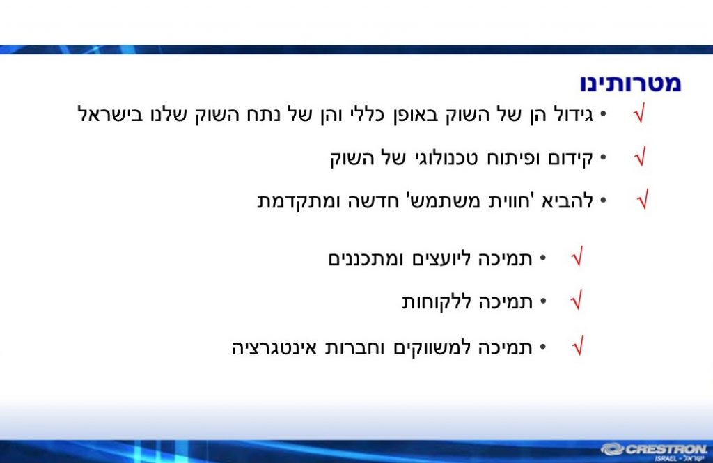 ברוקשטיין הציג שקף ישן שכלל את שלושת המטרות העיקריות שהציב לעצמו בשנת 2012, כאשר הקים את Crestron ישראל: