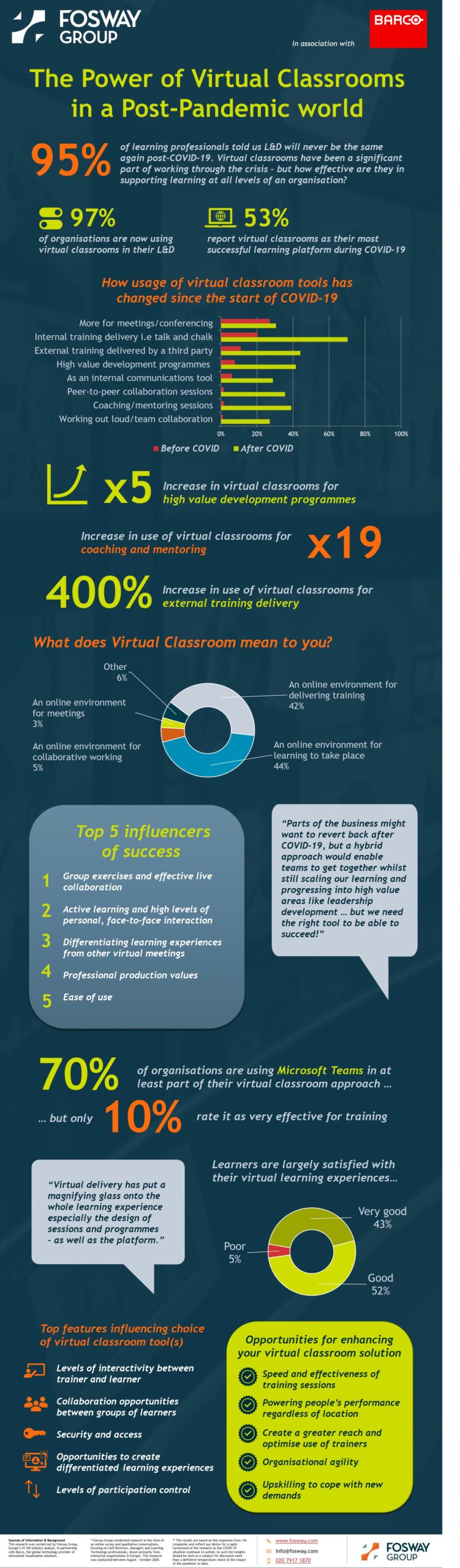 נתונים אלו, ואחרים, נחשפו במחקר שבוצע בין אוגוסט 2020 לאוקטובר 2020 עם תוצאות ראשוניות שהתקבלו מ-136 ארגונים בידי קבוצת פוסוויי (Fosway Group) , קבוצת מחקר המתמחה בשוק משאבי האנוש האירופאי, בשיתוף עם בארקו (Barco) שהיא ספקית גלובלית של פתרונות ויזואליזציה מרושתים. מדובר במחקר שעוקב לזה שביצעה פוסוויי מוקדם ב-2020 ממנו עלה כי 95% מובילי התחום הלימודי וההכשרתי בארגונים מאמינים כי הוא השתנה לחלוטין עם המגיפה.