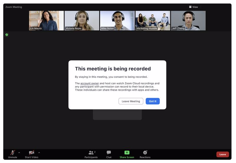 משתמשים יקבלו מעתה הודעה כאשר מוקלטת, או משודרת חי פגישה שבה הם נמצאים, יחד עם מידע על מי יכול לראות ולשתף את ההקלטה והשידור החי. המשתמש יכול להסכים להישאר בפגישה, או לעזוב את הפגישה אם הוא רוצה. בנוסף, משתמשים המצטרפים לפגישה מוקלטת בעיצומה יהיו מושתקים באופן אוטומטי (הן באודיו והן בווידאו) עד שילחצו על "המשך" בתיבת הדו-שיח. הודעות אלה יוצגו בפני כל האורחים המצטרפים לפגישה או לשידור חי מחוץ לארגון לו שייך החשבון, ללא קשר להגדרות בעל החשבון.