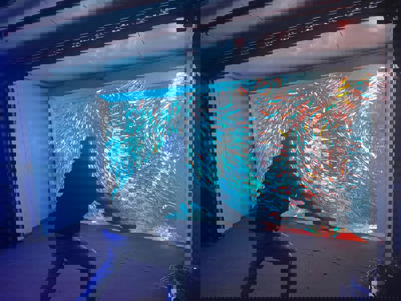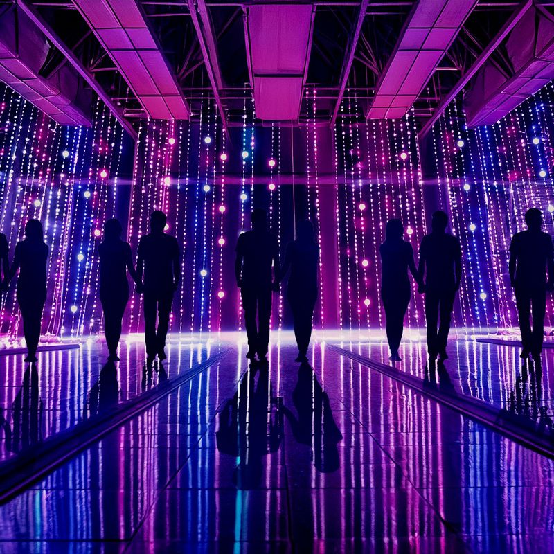 על שטח של 2000 מ"ר של טחנת הקמח וב- 14 חללים רחבי ידיים, פרושות יצירות אמנות דיגיטלית. מרבית התצוגות, העמוסות בחוויה צבעונית ועשירה בסאונד, משתפות בפועל את המבקרים, או מקיפות אותם מכל הכיוונים.