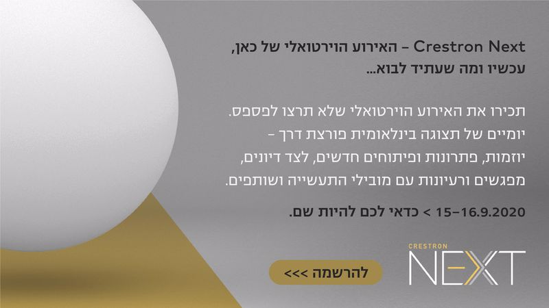 Crestron העולמית מציגה: Crestron Next. אירוע וירטואלי ראשון של החברה "הכאן, העכשיו ומה שיגיע בהמשך". במהלך השנה האחרונה הציגה Crestron חידושים רבים ומשני משחק, טכנולוגיות ומוצרים שמעידים על יכולות הגבוהות בהובלת התעשיה איתן היא מזוהה, ואת המחויבות שלה לחדשנות פורצת דרך.