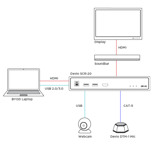 ליחידות ה-Devio בסדרה ממשקי USB לחיבור למחשב קבוע או נייד עבור שיחות וועידה, מעבד שמע מובנה (DSP), תאימות לרזולוציות עד 4K30 בחיבור HDMI ושני סוגי מיקרופונים לבחירה – שולחני או תקרתי. היחידות עצמן, כפי שניתן להבין מהצילום, קטנות וניתנות להתקנה מתחת לשולחן כך שיוסתרו מהמשתמשים.