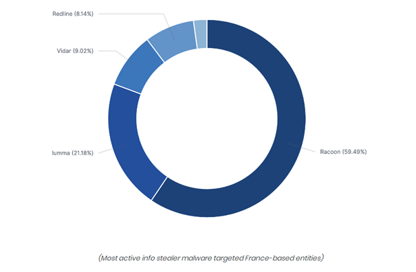 נתוני FortiGuard Labs מעידים כי Raccoon הוא כרגע ה-infostealer הפעיל ביותר בצרפת, המהווה 59% מכל האיתורים. Raccoon הוא נוזקה כשירות יעילה ולא יקרה הנמכרת בפורומים ברשת האפלה. הנוזקה גונבת סיסמאות הממולאות בצורה אוטומטית בדפדפן, היסטוריה, עוגיות, כרטיסי אשראי, שמות משתמש, סיסמאות, ארנקי מטבעות קריפטו ונתונים רגישים אחרים. במקום השני נמצאת Lumma (נוזקה כשירות נוספת מבוססת-מנוי) עם 21% ו-Vidar עם 9%.
