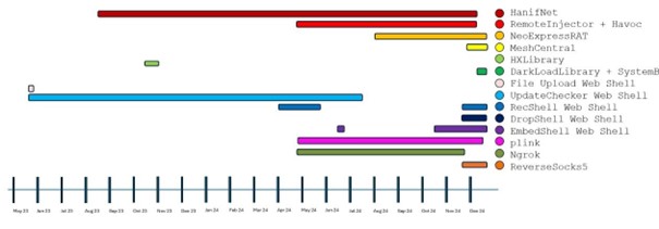 - ביסוס דריסת רגל ופעולות ראשוניות (מאי 2023 – אפריל 2024): התוקפים השתמשו בפרטי כניסה גנובים כדי לגשת ל-SSL VPN של הקורבן, פרסו web shells על שרתים חשופים לציבור והתקינו דלתות אחוריות של Havoc, HanifNet ו-HXLibrary. לאחר מכן, הם גנבו פרטי כניסה וביצוע תנועה רוחבית באמצעות RDP ו-PsExec.