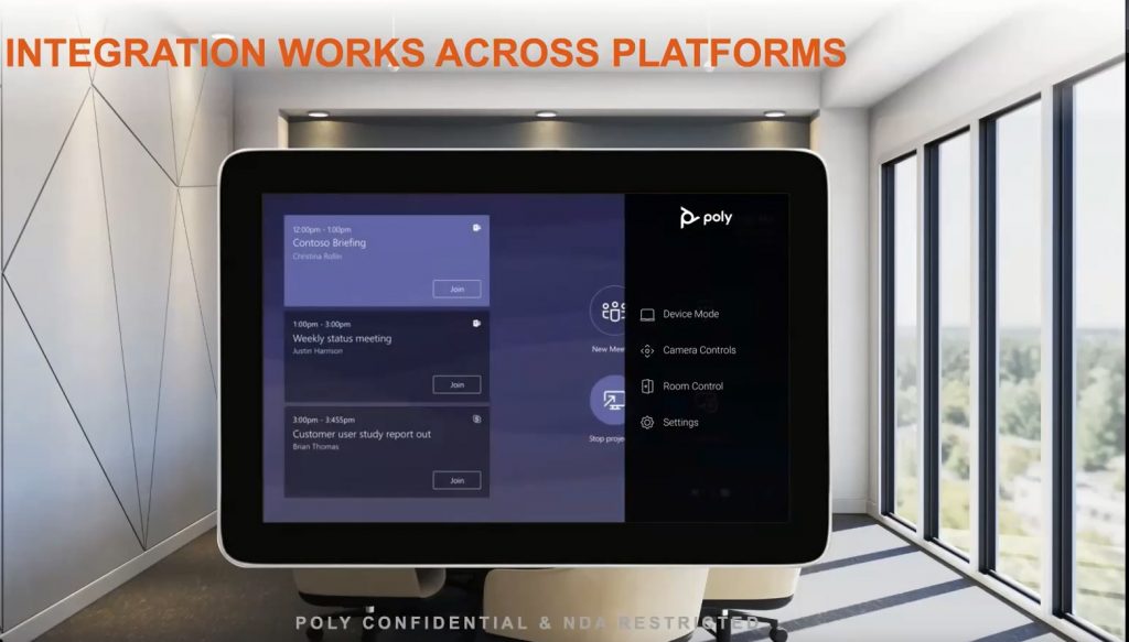 נתן גולדשטיין, Pre-Sale ב Poly: "זהו שיתוף פעולה ייחודי המאפשר שליטה על אביזרי החדר ישירות מ ה TC8 ללא קשר לפלטפורמה שבה הלקוח משתמש ZOOM\TEAMS\OTHER". כל זה מגיע בנוסף לתמיכה של Poly ב ZOOM control המאפשרת תמיכה דומה אך דרך ZOOM.