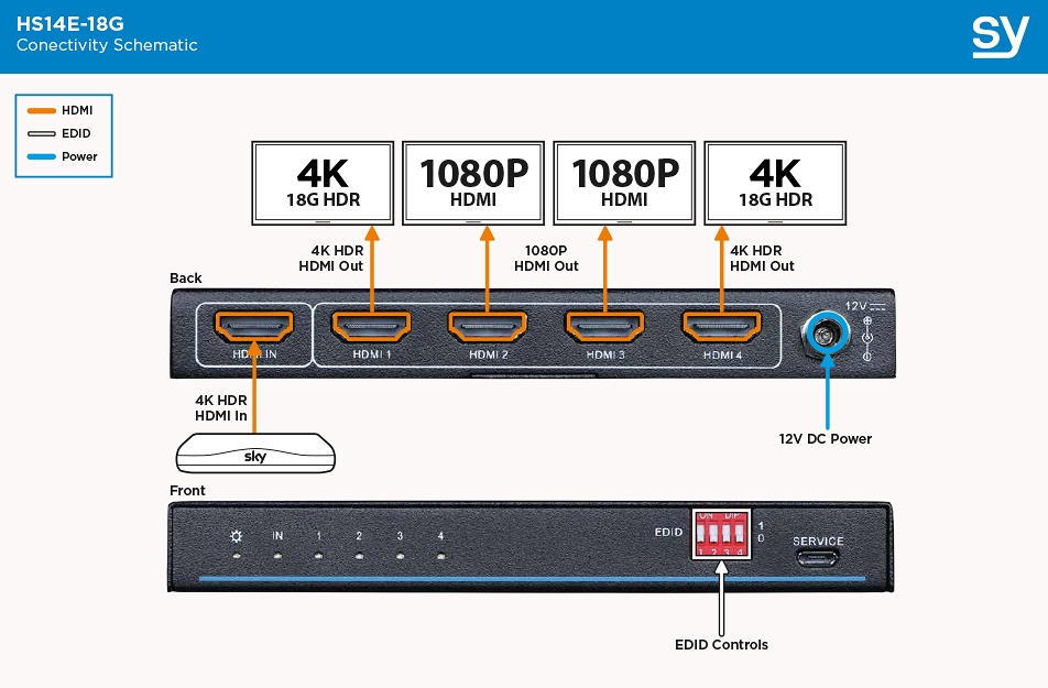 ה- HS14E-18Gמגיע עם 4 יציאות HDMI 2.0 ומסוגל להזרים תוכן 4K ממקור HD אחד ל-4 מקורות אחרים. הוא מסוגל להתמודד בקלות עם רזולוציות של עד 3840 x 2160 בתדר של 60Hz כולל HDR ומאפשר הזרמת תוכן באיכות שיא. מלבד וידאו, הוא גם מתמודד מצוין עם הזרמת סאונד בפורמטים שונים כמו 2 ערוצי PCM, Dolby/DTS 5.1 ואפילו LPCM בתצורה של 7.1.