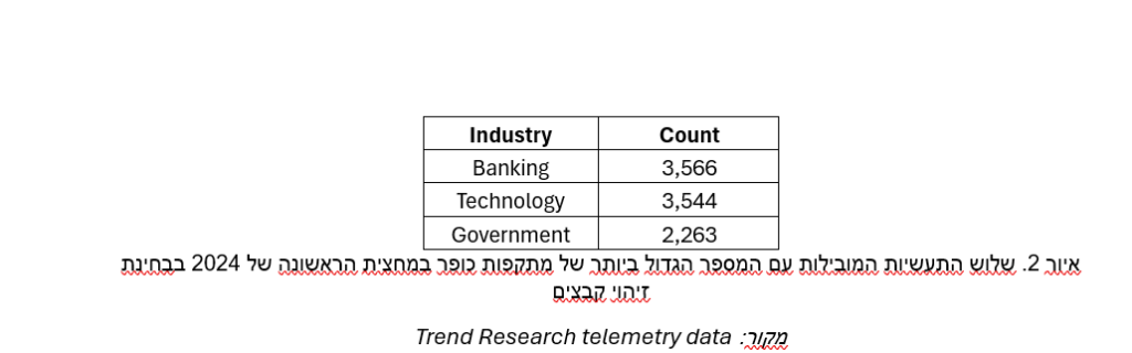 המגזר המוביל במספר התקיפות הינו המגזר הפיננסי כאשר המוסדות בנקאיים נפגעו בצורה הקשה ביותר ממתקפות כופר במחצית הראשונה של 2024. במקום השני במגזר המותקף ניצבים ארגונים בתחום הטכנולוגיה.