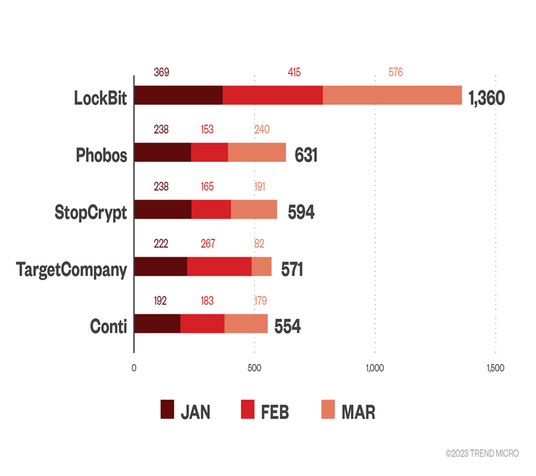 במקום השלישי ניצבת חבורת StopCrypt עם 594 סוגי תקיפות. השחקנית החדשה יחסית, TargetCompany, נמצאת במקום הרביעי, עם 571 תקיפות בסך הכל ברבעון הראשון, המהוות 1.3% מסך הגילויים. קבוצת Conti שהינה גם שחקנית מרכזית בנוף תוכנות הכופר נמצאת ממש צמוד עם 554 תקיפות שהתגלו. בעניין זה כדאי לציין כי הטלמטריה של חברת Trend Micro מזהה את גרסת LockBit Green כ-Conti, הודות לעובדה כי האחרונה מהווה הבסיס לפיתוח הגרסה של הקבוצה האחרת, דבר המגדיל את שיוך התקיפות לאחרונה. עוקבת אחרי החמישיה הראשונה בדירוג ובמקום השישי נמצאת קבוצת BlackCat הידועה לשמצה שהתגלתה ב-496 תקיפות.