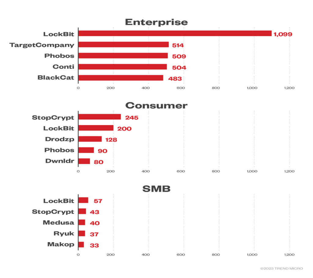 חמש משפחות תוכנות הכופר המובילות שהתמקדו בארגונים, צרכנים ועסקים קטנים עד בינוניים במונחים של זיהוי קבצים. מקור: יחידת מודיעין האיומים של Trend Micro