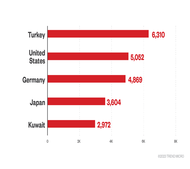 המחקר של יחידת מודיעין האיומים של Trend Micro מלמד כי טורקיה נפגעה 6,310 פעמים במונחים של זיהוי קבצי תוכנות כופר וקובצי כופר, מספר המהווה 14.6% מסך הגילויים ברבעון הראשון של 2024.
